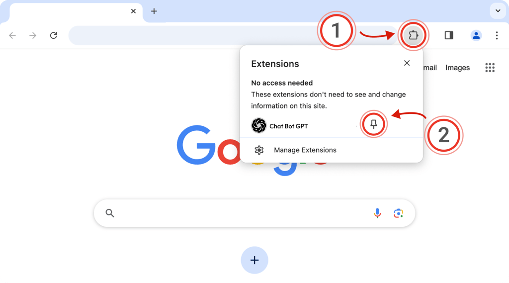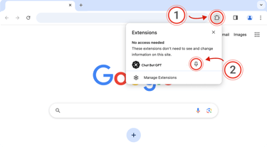 Click the puzzle piece (1) in the top right of your browser. Then, click the little pin (2) next to the extension: