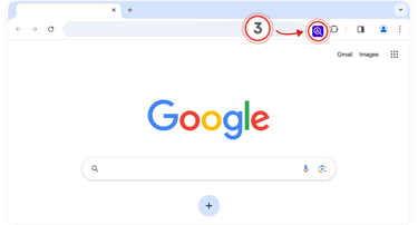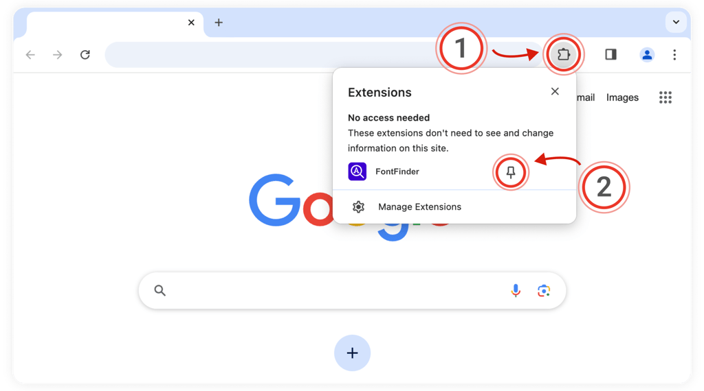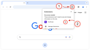 Click the puzzle piece (1) in the top right of your browser. Then, click the little pin (2) next to the extension: