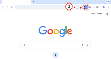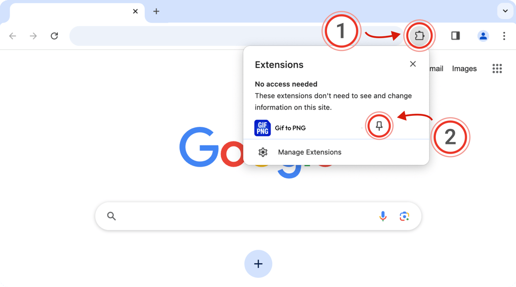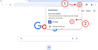 Click the puzzle piece (1) in the top right of your browser. Then, click the little pin (2) next to the extension: