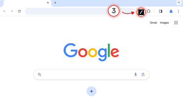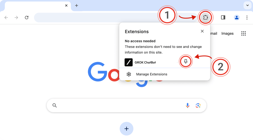 Click the puzzle piece (1) in the top right of your browser. Then, click the little pin (2) next to the extension: